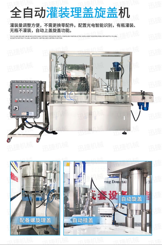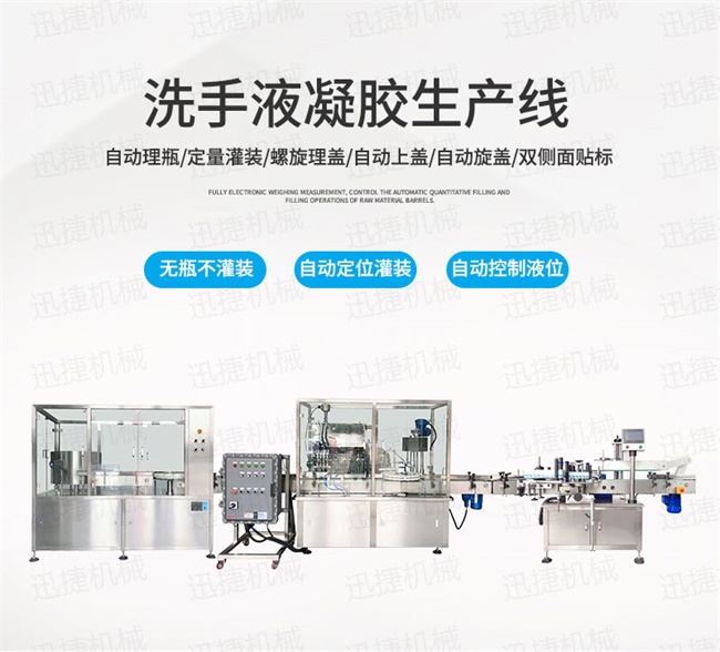 全自動凝膠生產(chǎn)線適用于消毒凝膠、免洗手洗手液、免洗手消毒凝膠、消毒液、84消毒液、醫(yī)用酒精、75%酒精消毒液、75度酒精、消毒水、殺菌消毒劑、醫(yī)用酒精、碘酒、次氯酸鈉、劑、醫(yī)用乙醇消毒液、瓶裝消毒劑等產(chǎn)品,有多頭全自動消毒液灌裝機和封箱機、貼標(biāo)機、打包機、噴碼機等配套設(shè)備組成,實現(xiàn)消毒液自動灌裝,自動旋蓋,自動貼標(biāo),從灌裝、到成品的全部過程