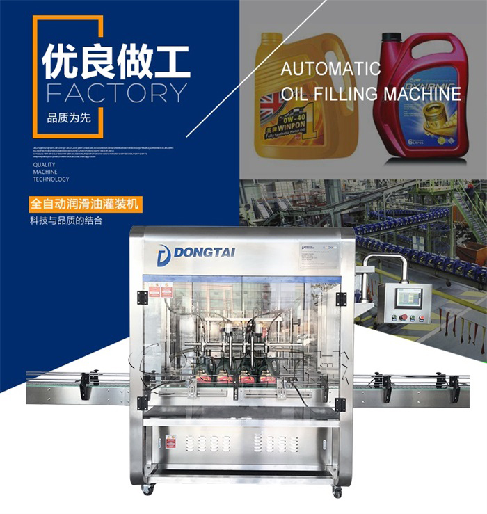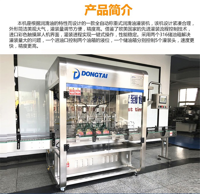 本機是根據潤滑油的特性而設計的一款全自動稱重式潤滑油灌裝機,該機設計緊湊合理,外形簡介美觀大氣,灌裝量調節方便,精度高。借鑒了歐美國家的灌裝流程控制技術,彩色觸摸屏人機界面,灌裝進程實現一鍵操作,性能穩定。采用兩個316儲油罐解決灌裝量大的問題,一個進油口控制兩個油箱的液位,一個儲油箱分別控制5個灌裝頭,速度更快,精度更高。